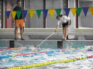 Pomocník (tapper) pomáhá plavci kategorie B1 na startovní blok a verbálně podává potřebné informace.
